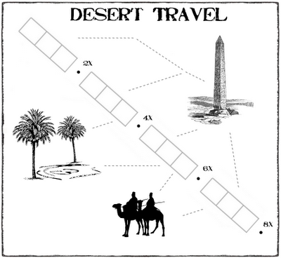 The desert is a grueling waste and the best way to deal with it is spend as little time there as you can. For every three days the party travels in the desert their food and water needs will multiply. Each day the party will see features that they can choose to explore or ignore. Exploring them will require an extra day. The features that might be seen during each three-day-span are linked with dotted paths. Landmarks are tombs and ruins or ancient stelae which might hold riches in gold or ancient knowledge. An oasis will provide food, water, and shade to a party for as long as they like; will allow them to re-stock their supplies; and will reset their place on the chart to the start. Caravans can offer food, water, and unerring transport, but may also be hostile bandits or slavers. Unfortunately, 50% of the time any of these will be mirages. And 25% of the time they will be one of the other two features.